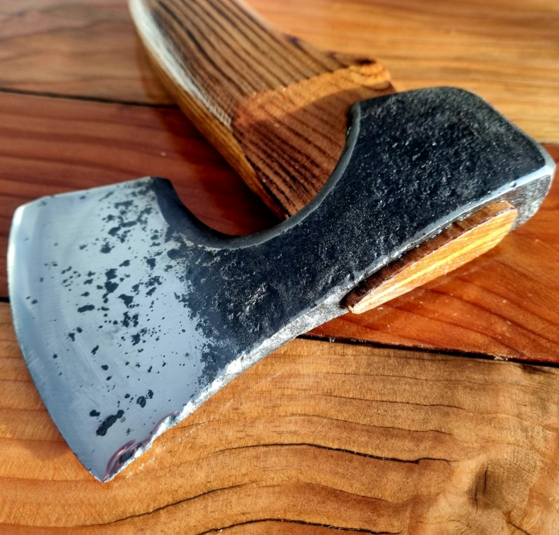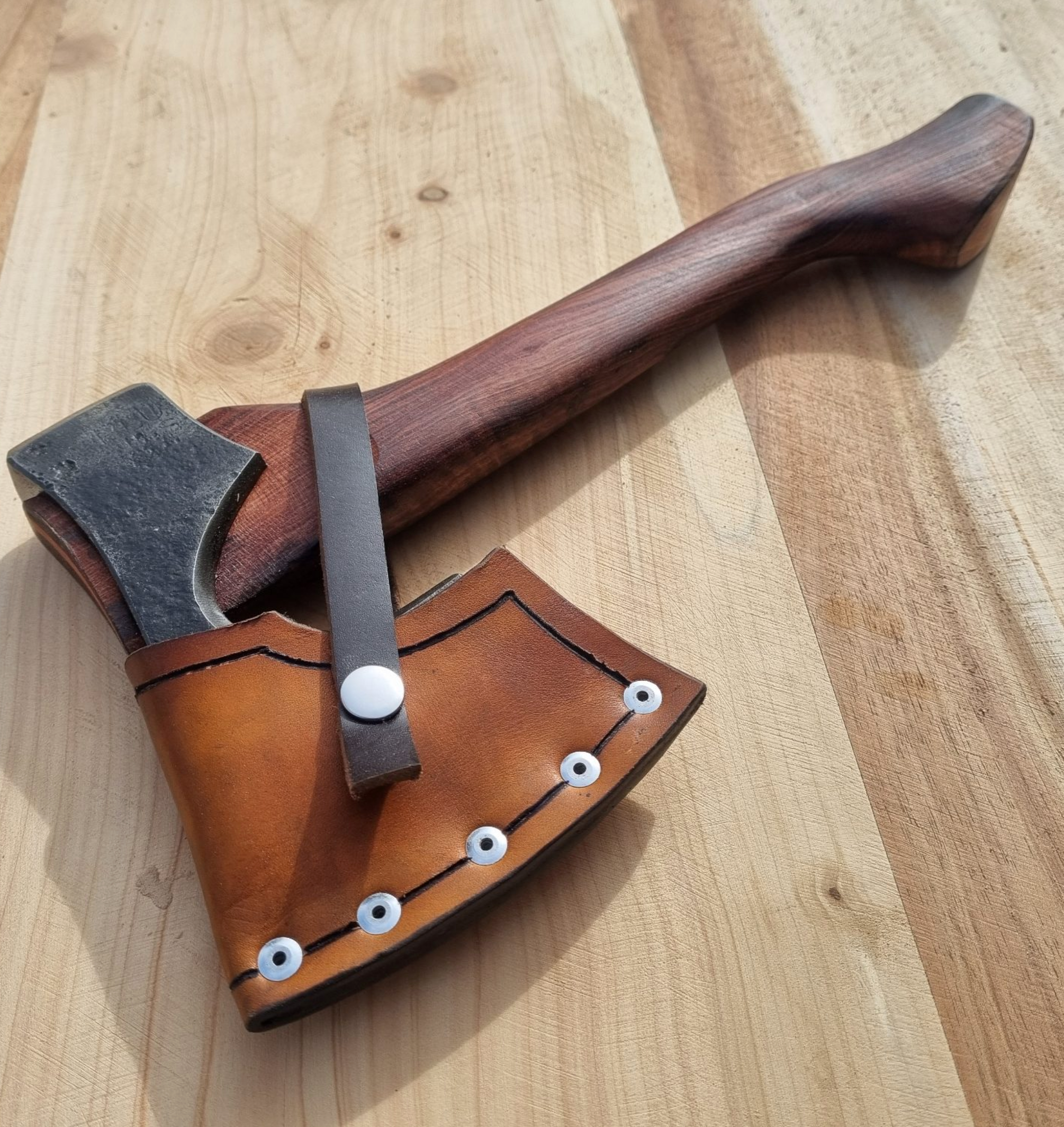 Each axe head is solidly hung with an English Oak wedge on a hand carved seasoned handle